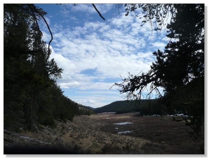 Just beyond that point, my topo map had shown the CO Trail crossing the Wilderness boundary again, but only for a short distance, and remaining inside by mere yards. It was getting late and I had reached my 2:30 pm turn-around deadline, but I was really curious to know if that little segment was really marked off or not, so I pressed on for another half mile. Reached the next creek crossing (of sorts) without seeing any signs, so I figure there would be no problems riding all the way to Lost Park Campground. If you did that, you'd end up with about a 40-42 mile out-and-back, but I was already past my deadline so decided to turn around and try to beat the inevitible darkness.