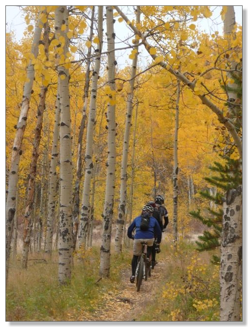 After all the work to get up the pass, turning around for a sweet six mile descent was just what the doctor ordered. Between the sleet and general joy of going downhill, there was minimal stopping until back in Aspen country, and the trail turned to gold coins. (BTW, disc brakes rule!):