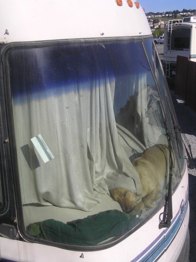 Carey had to work most of the days we were there, but at least he had a nice ocean view from his under-the-bed office. And a view of the neighbor's dog, who liked to cozy up on the sunny dashboard of the rig next door.
